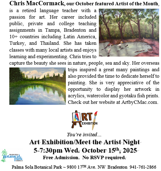 Chris MacCormack, our October Featured Artist of the Month, is a retired language teacher with a passion for art. Her career included public, private, and college teaching assignments in Tampa, Bradenton, and over 10 countries, including Latin America, Turkey, and Thailand. She has taken classes with many local artists and enjoys learning and experimenting.